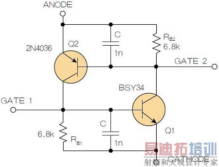 该器件一开始处于关断状态,在正向电流脉冲馈入门极1后,这个位于阳极和阴极之间的四层结构被导通,并且不再需要门极电流。此处还可以使用Q2基极导通SCR,但是单片SCR通常只有针对阴极的门极。