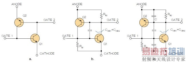图1:一个基本的SCR类结构(a),获得一定值的门极电流和维持电流(b),以及大幅改进的耐瞬变电压性能,从而有效防止阳极电压陡增引起的意外导通(c)。