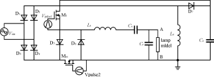 电子镇流器的主电路由PFC电路和谐振电路两部分组成。考虑到两级结构的成本过高,因此将两级中的功率开关管共用变成单级结构。图4所示主电路拓扑就是将Buck-Boost型PFC电路与并联负载串联谐振电路合成在一起,灯模型采用前面所提到的模型。