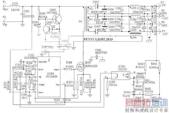 R101、R102为过流检测电阻,阻值较小,以降低电阻上的损耗。检测电压送入UC3843的3脚,高于1V时,过流保护电路工作,使6脚停止输出矩形波,电路停止工作。此外还可利用UC3843的1脚电压低于两个二极管压降时UC3843即关闭的特性给电源加上遥控端。