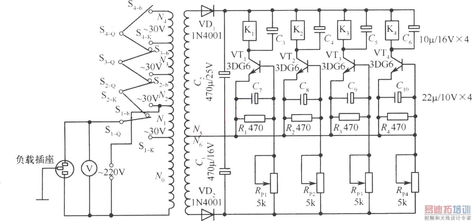 电路如图所示。它由一只自耦变压器和四级晶体管控制电路组成。当电网电压比较正常,为220V左右时,第二级控制电路工作,晶体管VT2导通,驱动继电器K2吸合,输出电压与电网电压相同,均为220V左右。当电网电压低于190V时,由于次级电压降低,迫使VT2截止,K2释放,VT3导通,K3吸合,使输出电压提升了30V。依次类推,直到电网电压低于130V时,使次级电压没有能力使4个继电器的任何一个动作,输出电压提升了90V,输出电压为220V。当电网电压高于240V时,VTl导通,Kl吸合,输出降低30V。