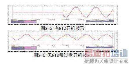 其中图2-5为使用NTC限流电路,在电源开启瞬间电压和电流波形。图2-6为零压开关电路,电流得到很好的控制,电流有一个从‘0’