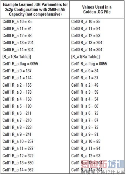 在创建黄金电量监测计(.GG)文件以后,应将基于周期数据的保守数值分配给Qmax值。每个电池的Ra表值分配集应相同,而并联电池的Qmax值也应相同。使用连续周期的非对称Qmax和Ra表开始值,可能会引起SOC误差和平衡问题。表2列举出了经过调整的黄金.GG值的一个例子,它可以改善2s2p电池组配置的电池平衡性。