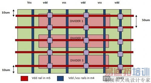 图字:分频器1;分频器2;分频器3;M5上的Vdd导轨;M5上的VSS导轨;M4上的VDD/VSS
