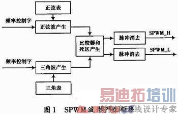 正弦波产生模块根据主控制器传来的频率控制字从ROM表中读出相应的正弦波的离散值,同样,三角波产生模块根据频率控制字从存储三角波的ROM表中读出三角波的离散值,比较器和死区产生模块根据传来的正弦波和三角波的离散值进行比较,直接进行比较产生上桥臂驱动信号,将正弦波离散值或三角波离散值加上一个特定的值或减去一个特定值再和三角波进行比较,产生上桥臂对应的下桥臂驱动信号,这时产生的信号已经是带死区的SPWM信号,再经过脉冲消去模块,消去功率器件来不及反应的窄的驱动信号,最后就可以得到直接驱动逆变器的一对SPWM信号。