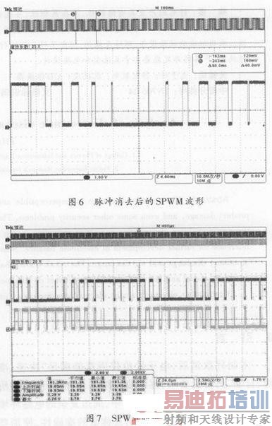 在产生的SPWM脉冲中,完整的SPWM脉冲序列包含了占空为从0~100%的脉冲,因此有些脉冲的宽度可以达到非常小,而实际上,过窄的脉冲是无用的,因为在这样短的脉冲持续时间内,后级的功率放大管是不能完全导通或关断,只会增加功率器件的损耗,所以必须删除这些不良窄波;如图4所示,第二路的SPWM波形会出现比第一路SPWM波形小两倍死区时间的脉冲,如果某个脉冲已经在临界的宽度了,经过死区产生模块就会变成一个对后级的功率管来说过窄的脉冲,这也就是脉冲消去模块在死区模块后级的原因,它的作用是消去一些本来就有的和经过死区处理后的毛刺。处理后的波形如图6所示,图7为处理后的一对带死区的SPWM波形。