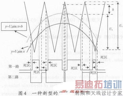 软件实现方法与脉冲消去方法大致相同,一般都是设计一个加减计数器,根据死区时间来确定加减计数器的最大值d,由计数器的最大值d来确定死区时间。这种实现方法是一般的实现方法,本设计提出了一种新型的死区产生方法,如图4所示,实线表示正常采用自然采样法的正弦波形和三角波形,正弦波y=Ussin x的半波的幅度为Us,三角波的幅度为Ut,根据自然采样法的原理,这里假定正弦波大于三角波时输出为高电平,小于时输出为低电平,根据正弦波和三角波的交点及电平输出的判断规则可以得到SPWM脉冲的第一路波形,这时把正弦波向上平移b个单位,如图4中的虚线,正弦波形y=Ussin x变为y=Ussinx+6,再根据自然采样法的原理用平移后的正弦波和三角波相交,根据交点判断输出高低电平,这样判断输出的电平高低就可以得到第二路的SPWM波形,生成了SPWM波形的死区,在本设计中采用的是数字方法产生SPWM,根据图4,可以在程序中按原来的方法产生第一路信号,把从ROM中取出的正弦信号加上b,再和原来的方波信号进行比较,这样就可以得到第二路SPWM信号,同样道理,也可以把三角波向上平移b个单位来产生第二路SPWM信号,但不管平移正弦波或三角波,都要保证平移后的正弦波的波形幅度要小于三角波的波形幅度。也可以设计第三个ROM,在程序外把经过向上平移后的正弦波形进行量化,存入ROM表中,在程序中用这个表和三角波的离散值进行比较,只是这样设计会增加FPGA硬件资源的消耗和增大存储器的存储空间。
