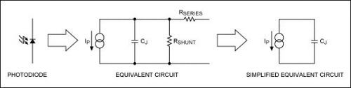 图4. 光电二极管等效电路:IP = 光电流;RSHUNT = 二极管结电阻;CJ =结电容;RS = 串联电阻。