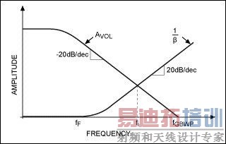 图5. 开环增益(AVOL(jω))、反馈系数的倒数(1/β(jω))随频率的变化。两条曲线闭合的速率决定了发生振荡/自激的可能性。