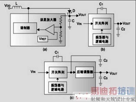 3 种电荷泵的工作过程均为:首先贮存能量,然后以受控方式释放能量,以获得所需的输出电压。开关式调整器升压泵采用电感器来贮存能量,而电容式电荷泵采用电容器来贮存能量。