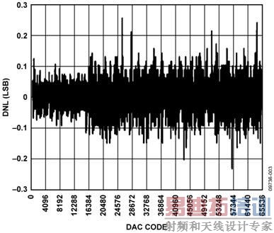 AD5751是一款单通道、低成本、精密电压/电流输出驱动器,设计用于满足工业过程控制应用的需要。AD5751的工作电压范围是10.8 V至55 V,电压输出可以高达44 V。电压输出范围可以编程为PLC和DCS应用的标准输出范围及20%超范围设置:0 V至5 V、0 V至10 V、0 V至6 V、0 V至12 V。此外还提供两种高压输出范围:0 V至40 V和0 V至44 V。 电流输出通过单独的引脚提供,可以编程为以下标准范围:4 mA至20 mA、0 mA至20 mA、0 mA至24 mA。此外还有2%超范围设置,提供3.92 mA至20.4 mA、0 mA至20.4 mA和0 mA至24.5 mA。如果需要,可以将电压和电流输出引脚连在一起,以便将终端系统配置为单通道输出。 AD5662是一款单通道、低成本、低功耗、轨到轨电压缓冲输出 nanoDAC 器件。在0.75 V至VDD电源电压的宽基准电压范围内,AD5662保证±1 LSB的DNL。在图1所示电路中,AD5751和AD5662采用ADR444提供的4.096 V公共基准源工作。整个系统都能受益于ADR444的超低噪声和低温漂特性。ADR44x系列基准源可以流出和流入电流,因此非常适合驱动基准电压或电源输入。AD5662还内置一个上电复位电路,确保DAC输出上电至中间电平或0 V并保持该电平,直到执行一次有效的写操作为止。 ADuM1301是一款三通道数字隔离器。ADuM5401是一款四通道数字隔离器,集成isoPower®隔离式DC/DC转换器。它们均基于 iCoupler® 技术,用来在信号链与系统微控制器之间实现隔离,隔离额定值为2.5 kV rms。ADuM5401为副边的所有电路提供5 V隔离电源。 数字电源与模拟电源应分离,通过铁氧体磁珠连接。各电源引脚通过并联的10 μF电容和0.1 nF陶瓷电容进行去耦。更多信息请参见CN0204设计支持包 中的原理图。 用于PLC和DCS应用的器件所需的ESD保护和过压保护一般远高于形式上的推荐要求。AD5751的各引脚内置ESD保护二极管,可以防止瞬变损害器件。但是,工业控制环境可能会使I/O电路遭受高得多的瞬变。EVAL-CN0204-SDPZ电路板内置外部64 V/1500 W瞬变电压抑制器(TVS)、50 mA/30 V自恢复保险丝(PolySwitch)和肖特基功率二极管,以提供更高电压的ESD保护、50 mA过流保护和64 V过压保护。图1的原理示意图未显示可选的外部保护电路,但可以在CN0204设计支持包的详细原理图(EVAL-CN0204-SDPZ-SCH pdf文件)中找到: www.analog.com/CN0204-DesignSupport本电路必须构建在具有较大面积接地层的多层电路板上。为实现最佳性能,必须采用适当的布局、接地和去耦技术(请参考指南MT-031——"实现数据转换器的接地并解开AGND和DGND的谜团" 以及 指南MT-101——"去耦技术")。 测量对于PLC、DCS和其它过程控制系统,积分非线性(INL)、微分非线性(DNL)和输出误差是最重要的性能指标。AD5751具有非常灵活并且可配置的输出范围,可以满足应用需要。该电路的INL、DNL和输出误差测量结果分别如图2、图3和图4所示。测量条件为25°C、电压输出模式并且使用内部电流检测电阻。AD5751范围设置为0 V至5 V。所有其它范围的测试结果如表1所列。 表1所示测试结果是在25°C下使用EVAL-CN0204-SDPZ电路板和Agilent E3631A直流电源,利用Agilent 34401A数字万用表测得的。 注意,客户需要调整输出范围0 mA至20.4 mA和0 mA至24.5 mA,以便与0 mA至20 mA和0 mA至24 mA范围完全匹配。0 mA至20.4 mA范围下的1.70% FSR输出误差包括增益误差,增益误差可以由客户通过校准消除。