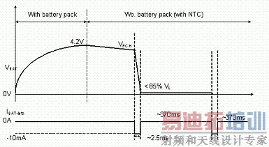 使用者亦有可能在充电或式充电完毕后,在未将电源移除的情况下,即抽离电池的情况。为避免造成危险,IC内部应具有如图7, 8的电池存在侦测机制。充电IC会以短时间脉冲(每370ms产生2ms的脉冲)方式抽取电池电流,此时若电池存在,则侦测到的电池电压应大于一预设阀值;若电池已切离,则充电IC侦测到一低电压,即可判定为电池断开状态,并将电池端电压切断,保护使用者安全。