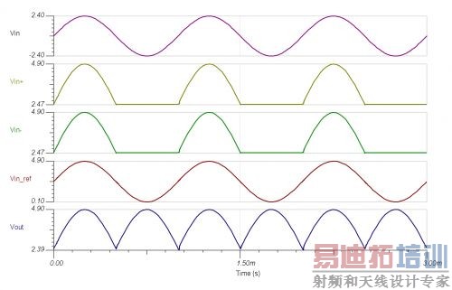 图 3 改变 U2 的参考电压对整流器输入范围的改变情况图 4 显示了图 3 电路的运行情况。图 4 中,顶部轨迹线 (Vin) 参考中间电源电压,因此它似乎为双极—标识为 Vin_ref 的轨迹线为参考电压的实际输入电压,其在所有时间都明显地维持在参考电压以上。