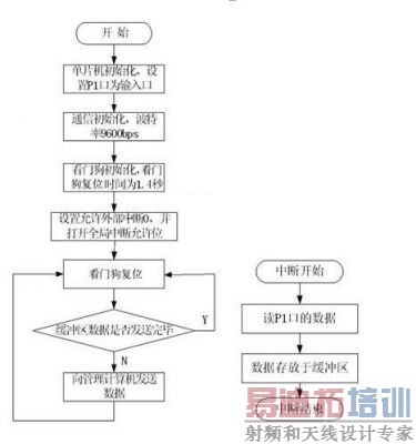图4为单片机程序流程图,程序由主程序和中断服务程序构成。其中,中断服务程序负责及时采集接受控制设备发送到并行口的有效数据,并存放于缓冲区。主程序主要负责与管理PC机进行串行通信,转发缓冲区中的数据。这样,管理PC机只需要用可视化编程语言实现一个数据接收、文件存储功能的软件即可为今后的数据统计、分析奠定基础。