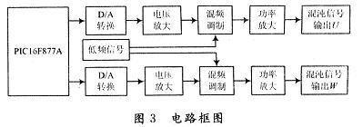 基于最经典的Lorenz混沌方程,用输出电压U,W代替Lorenz混沌系统中的两个变量x,z;利用单片机PIC16F877A软件编程方法产生二路数字混沌信号,再经D/A转换成模拟混沌信号、电压放大后与低频信号混频、调制,再进行功率放大,从而得到可应用于生物医学的混沌信号源。具体框图如图3所示。