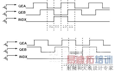 在使用增量式编码器时,通过计相位相差90o的两路正交脉冲信号A和B的上升沿与下降沿已达到将增量式编码器的反馈脉冲四倍频的目的。这样在不增加增量式光电编码器的线数的情况下,就可以获得更精度高的位置脉冲信息,以实现对电机位置的精确控制。其工作原理与脉冲的相位关系如图5所示
