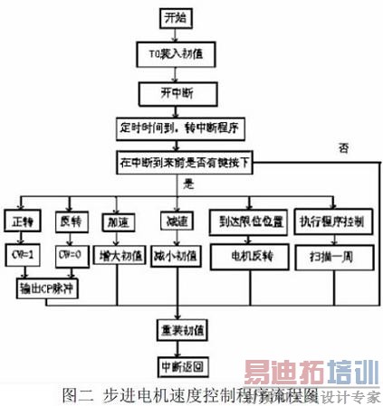 改变驱动模块CP 信号的频率来改变步进电机的转速,改变CP 信号的频率可以通过定时/ 计数器来实现。先给定时/ 计数器装载初置,后使其开始运行,到达规定的时间后执行中断程序,此时可将产生CP 信号的程序放在此中断程序中,就达到了改变步进电机转速的目的。S52 内部的T0 和T1 分别对应了两个步进电机的速度控制,其工作过程如图二所示。