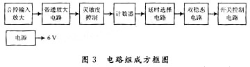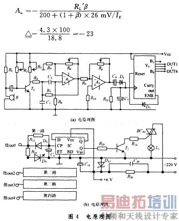 图4(a)为音控输入放大电路、带通放大电路、灵敏度控制与信号处理电路和计数器电路的电原理图。图4(b)图为双稳态电路、开关控制电路和电源电路的电原理图。