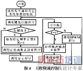 图4示出主程序流程图。它包含初始化子程序、HPWM信号产生子程序、键盘扫描和显示子程序。初始化子程序中,80C196MC对堆栈地址及载波频率等参数进行初始化,并对单片机本身的各个I/O端口、中断及波形发生器等设定工作方式。可通过键盘给定所需输出的正弦波频率,由显示程序进行显示。显示子程序可对电压信号进行定时采样,A/D转换后,动态、分时显示正弦波的频率和幅度值。