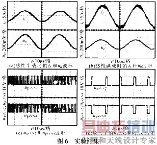 采用上述主电路结构、控制方式,研制了输出频率为25kHz;载波频率为600kHz;输出功率为4.5kW的原理样机。图6a,b示出感性半载和感性满载时的滤波电感电流iL和输出电压uo实验波形。由图可知,在半载和满载时,uo的变化较小,有较好的负载调整率。图6c,d示出逆变桥同一个桥臂两个功率管VS2和VS4的驱动电压ugsVS2和ugsVS4及其放大了的ugsVS2和ugsVS4实验波形。可见,考虑到死区,同一桥臂的两个功率管是互补导通的。功率管的驱动电压波形的上升和下降延迟时间都非常短,能够满足要求。