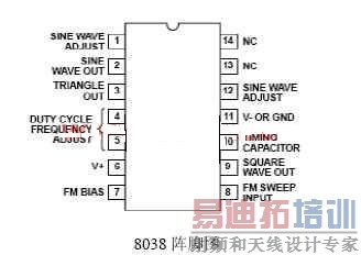 这里采用集成函数发生器ICL8038构成扫频信号发生器,它主要用于直接测量各种频响特性,其输出信号频率在一定范围内反复变化,内部主要有矩形波,三角波和锯齿波发生电路和三角波变正弦波电路.该集成模块常用引脚如图所示.该电路具有结构简单,实用可靠的特点,采用单电源供电.Vcc=±5V---±15V.这里采用±15V输出频率1---600KHz,输出矩形波的占空比为避免2%----98%,在本次设计中,输出频率为9—10Hz,