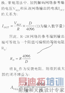 输入不同的数字量D,就可以在1~4096间设定放大器的电压增益。图1中的两个外接电位器W1、W2分别用于对放大器的失调和增益误差进行微调,可进一步提高放大器的精度,要求不太高时也可以省去。