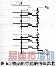 数字电位器的内部结构如图6所示,它用控制MSO管的开关来调节滑动端VW在VH和VL之间多个等值电阻的位置,抽头数越多,等值电阻越多。调整的范围越宽,对DC-DC变换器的输出电压调整幅度越小。