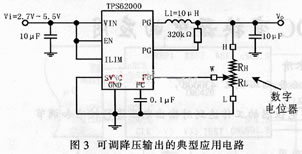 TPS62000DGS的输出电压可调,通过调整反馈引脚FB的电压值来达到输出电压V0的变化,采用数字电位器来调节反馈引脚FB的电压。在图3中,H为数字电位器可调电阻器的高电压端,L为数字电位器可调电阻器的低电压端,W为数字电位器滑动电压输出端。输出电压的计算公式为V0=0.45V×(1+RH/RL),其中要求RH+RL≤1MΩ,每次调接的电阻值为1kΩ。3线接口可设计成单片机控制或按键直接控制(外扩逻辑电路),在减小数字电位器RL的阻值时,输出电压V0会增加。由于该器件是DC-DC降压器件,因此输出电压V0最大值为输入电压VI。