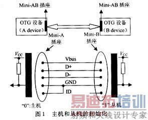 设备的初始功能是通过定义连接器来实现的。OTG定义了一个叫做MiniAB的袖珍插孔,他能直接接入MiniA或者MiniB插口,MiniAB有一个ID引脚 上拉至电源端,MiniA插头有一个与地连接好的ID(R<10 Ω),Mini B插头有一个与地连接的开路ID引脚(R>100 kΩ)。当2个OTG设备连接到一起的时候 ,MiniA插头边的ID引脚会注入一个"0"状态,MiniB插头边的ID引脚为 "1",ID为0的OTG设备默认为主机(Adevice),ID为1的OTG设备默认为从机(B device)。图1对上述内容进行了图解[4]。