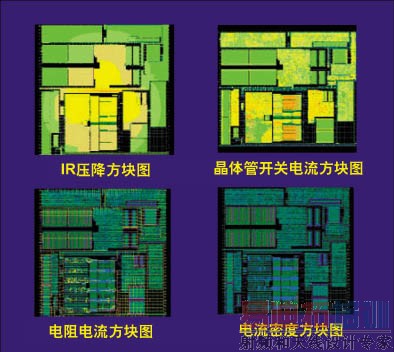 在定型的DEF上用VS SoC进行全芯片分层式分析, 400MHz的SUN Ultrasparc-II工作站需要运行22分钟并占用550MB存储器。除了IR压降分析,全芯片分析还产生了其他一些电源网络信息,包括电阻电流、抽头电流(tap current)和电流密度方块图。图4的方块图将电源网络的行为形象地表现出来,例如,抽头电流的分配表明存储器中电流非常低,DSP内核中的电流较高,正如预期那样。