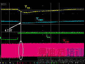 额定输出电压是400V直流。在图5中,可以看出,当输出电压达到420V,开关立刻截止。输出电压的过冲被限制在额定电压的5%以下。输出过冲电压保护也采用同样的控制策略。在图6中,可以看出,当Vsense下降到4.75V,也就是比额定电压低5%,IC立刻响应,门驱动的占空比立刻增加。电压降被控制在40V以内。