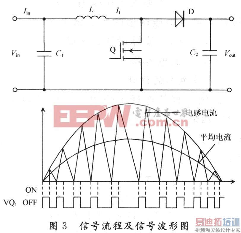 在图1中,5脚是零电流检测输入端,接在变压器二次侧,因而检测到的是电感电流,即外电源流入负载的电流。当电感电流为零时,ZCD的输出翻转,将内部的RS触发器置“1”,7脚输出高电平,使Q1导通。外电源通过桥式整流,使变压器一次侧和Q1导通,电流流过变压器一次侧,将电能储存于电感中。当电感电流增大到一定值时,Q1又关断,这也是通过RS触发器进行控制的。1脚接PFC输出电压的分压,该电压经EMP放大后,与由3脚输入的电压分压值在MULT中相乘,MULT的输出与由4脚输入的Q1的电流比较。 当输入Q1的电流值大于MULT输出的电流值时,OIC输出电平翻转,将RS触发器置“0”,该电平由7脚输出,关断Q1。因此,MULT的输出电流即通过Q1的电流的门限值,该门限值随输入电压的变化而近似呈正弦规律变化。当Q1关断后,变压器一次侧的电流逐渐减小,当此电流接近零时,又导致ZCD的输出翻转,将RS触发器置“1”,Q1导通,重复以上过程。 当负载突然关断、启动或输出端出现浪涌时,会出现输出电压过高的情况,这时OVC会发挥保护作用。此时,过压保护器的输出电平发生翻转,将RS触发器置“0”,关断Q1。器件内设定的比较器门限电压为1.08 V。欠压锁定的作用在于监控电源正极电压。当8脚的电压Vcc低于下限值时,UVLO输出低电平,7脚也输出低电平,关断Q1。定时器的作用是在电感电流下降到零时启动Q1。 2 系统主要技术指标的设计 根据需要,设计了一个150 W PFC系统,其信号流程及信号波形如图3所示。其主要参数为:交流输入电压范围为175~265V;最大输出功率为150 W,若Boost电路的提升电压为400 V,则额定直流电流为375 mA;若转换效率为η=90%,则额定输入功率Pin=P0/η=167 W;最小开关频率选为fmin=25 kHz;输入偏移因子IDF=0.98;最大纹波峰一峰值为8 V。