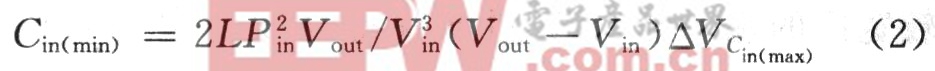 式中:Vin为稳压输人峰值电压最大值;Pin为输入功率最大值;fmin为开关频率最小值。将主要参数代入式(1)得: L=544μH 在该设计中取L=550μH。 3.2 输入滤波电容的设计 输入滤波电容的主要作用是滤除输入端的高频噪音,其容量很小。但如果其取值太小,很难较好地滤除输入的高频噪音,另一方面其取值又不能太大,否则会引起较大的输入电压偏移。 3.2.1 输入滤波电容的下限值 输入滤波电容的下限值由输入滤波电容的最大纹波电压决定,可用式(2)计算: [p]