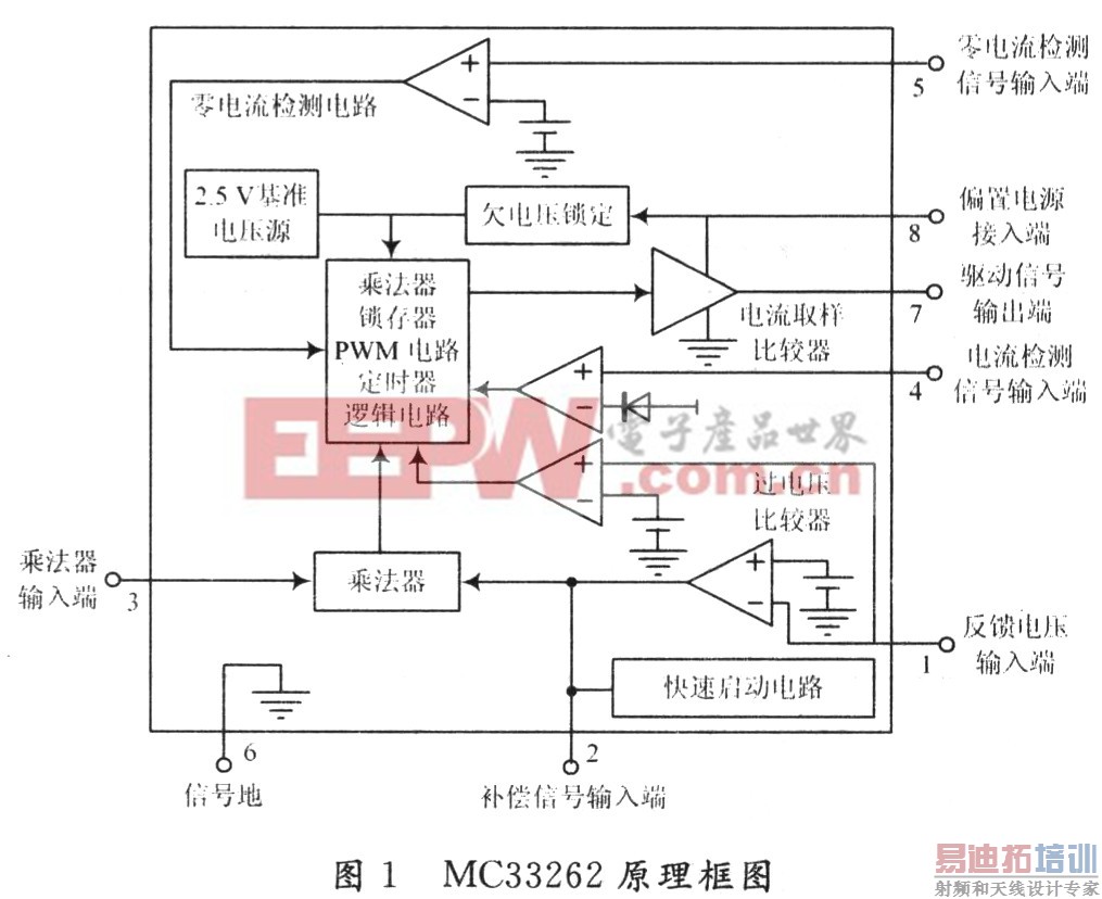 目前,用于实现临界导电模式的控制芯片有很多,由MC33262构成的采用Boost变换器的APFC电路。MC33262原理框图如图1所示。