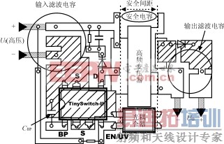 TinySwitchII芯片的印制板元器件布置图,如图3所示,这里未使用欠压保护电阻。设计印制板时必须注意以下事项:
