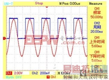 过零检测电路在外加信号频率为50Hz正弦波时的实验波形图如图4所示。
