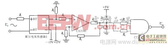 过零检测电路原理图如图2所示。电路中采用宇波CHV-25P霍尔电压传感器,此霍尔电压传感器的额定电流为10mA,原边与副边匝数比为 2500:1000,所以在将A相电网电压接入霍尔电压传感器前,需要通过一个限流电阻进行限流,以免电流过大将霍尔电压传感器烧坏,它的M端为副边电流输出端,需要加一支采样电阻,将电阻上的压降引入一个由运算放大器CA3140及四个电阻组成的滞回比较器,然后在其输出端通过一个由两个二极管组成的钳位电路之后,将高低电平锁定为5V和0V,然后再进入一个与非门CD4093,对输出信号进行整形,将信号变成高电平为5V,低电平为0V的标准的方波,然后此方波会作为锁相倍频电路的输入信号。