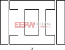 常见的多功能铁心结构主要是平面布置的形式(图9)。图9(a)是一个变压器和一个电抗器的铁心结构。图9(b)是一个变压器和两个电抗器的铁心结构。图10巧妙地采用两种软磁材料组成多功能铁心结构。图10(a)外框铁心采用高导磁合金材料,形成变压器,中间采用低导磁材料形成电抗器。除了这种框形加中间柱结构而外,还有图10(b)的桥式多功能铁心结构,四个桥臂用高导磁材料,桥对角线用低导磁材料或者开一个气隙。