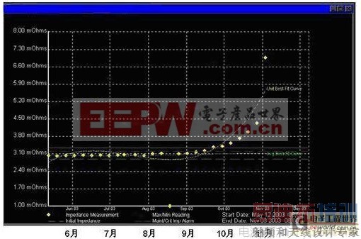 黄色趋势线显示蓄电池的内阻在10月到11月期间因为各种原因急剧上升,因此可以判断出蓄电池的状态已经严重劣化,经过对电池的放电证实的确是电池已经失效。