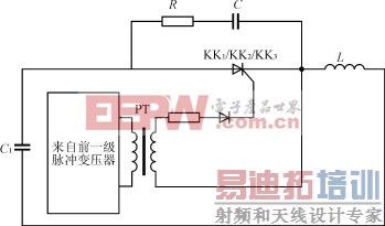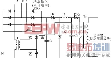 1)预充电过程三相交流电经半波整流对电解电容 C 1经限流电阻 R 1预充电到250V,然后改由快速晶闸管KK0对电解电容 C 1直接充电到310V。在电解电容 C 1充电时,A相电压经变压器升压全桥整流后经限流电阻 R 2对脉冲电容 C 2充电到400V。预充电结束后变压器通过继电器与脉冲电容器隔离。