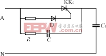 图2是快速晶闸管KK0的触发电路。KK0的触发是利用电源电压经二极管D整流实现同步触发。这样当某相电压高于电容 C 1上电压时,触发极与阴极间也承受正向电压,晶闸管触发导通,实现对电容 C 1上能量的快速补充。电容充电回路中不加限流电阻一方面保证了电容 C 1上电压的快速恢复到310V左右,另一方面电容 C 1上电压的迅速上升避免了触发极与阴极间电压过高而损坏晶闸管。