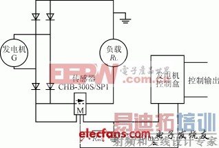 在某型地面车辆上装备了一套独立的大功率发电系统,该发电系统设计选用了CHB-300S型闭环霍尔电流传感器作为系统电流检测部件,通过对传感器的输出信号进行处理,设定限流工作点,确保发电系统的输出功率不高于发电机的额定功率。闭环霍尔电流传感器CHB-300S的应用,很好地实现了上述应用目的。如图3所示,发电机G输出正端汇流母线穿过CHB-300S/SP1的原边电流穿孔,由传感器CHB-300S/SP1检测发电机的输出电流,传感器的输出 I M与发电机控制盒相连,由发电机控制盒设定发电机的输出电流控制点,依据此信号,对发电机的输出电流加以限制,避免发电机因输出功率过高而发生故障或损坏,从而保证发电系统正常工作。