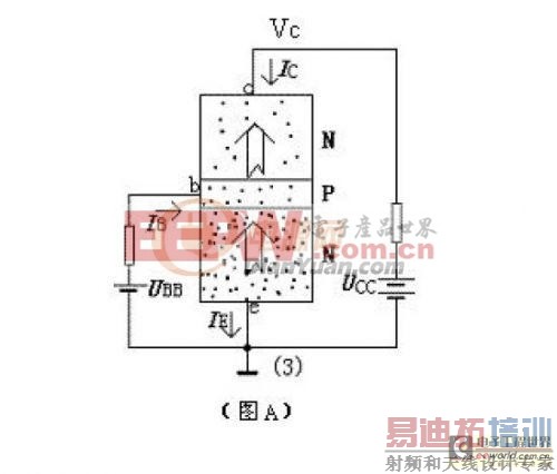 传统讲法一般分三步,以NPN 型为例(以下所有讨论皆以NPN 型硅管为例),如示意图A。1.发射区向基区注入电子;2.电子在基区的扩散与复合;3.集电区收集由基区扩散过来的电子。”(注1)