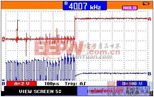 开机前,线圈强制短路,开机后保护过程波形:红色曲线为驱动芯片使能脚,蓝色为驱动波形。