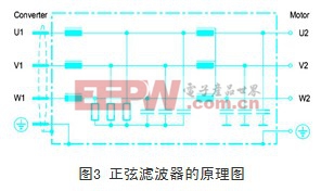 下面介绍这种全新滤波技术,与传统滤波器的布局技术相比,新的正弦滤波器可同时实现三个功能:把相位对相位电压转变为正弦信号、抑制共模电流和把导体到地电压变成正弦波电压。图2为正弦输出滤波器的安装位置示意图。