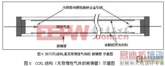 冷阴极荧光灯(CCFL)是一种长而细的密封玻璃管,内充惰性气体(图5)。