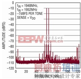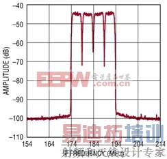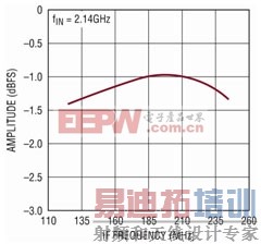 例如,LTM9003-AA 采用一个低功率、硅锗有源混频器,该混频器用 3.3V 电源工作。2 × RF - 2 × LO 分量产生 60dBc 的二次谐波,这是频谱中最严重的杂散噪声。用一个类似的 5V 器件替换该混频器,就能以功耗为代价降低这一杂散噪声。在 LTM9003-AB 中,该二次谐波就减小了 4dB。类似地,更换消耗较低功率的 210Msps ADC,就可以降低采样率,另外还可以改变 L-C 滤波器的值,以实现不同的滤波器带宽,但仍然能实现卓越的通带平坦度。