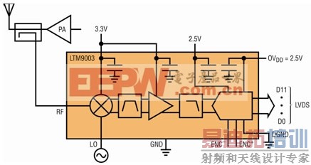 尽管数字预失真的数字算法引起了相当大的关注,但是模拟接收器设计要求也是很苛刻的。LTM9003 微型模块接收器在单个纤巧封装中集成了整个接收器,从而简化了这种设计。