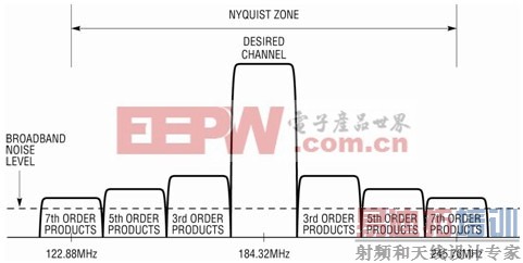 目前的开发趋势是将所需通道混频至中频 (IF) ,并捕获所有互调分量的全部带宽。要准确选择中频以减轻滤波负担,并避开按照规范要求已经确定的其他频率。类似地,采样率也要选择为数字调制芯片速率的倍数,例如,在 WCDMA 情况下为 3.84MHz。最后,奈奎斯特 (Nyquist) 定理要求,采样率必须至少是采样带宽的 2 倍。尽管很多配置都是可接受的,但是这里仅列出一组满足这些限制的配置,中频为 184.32MHz,ADC 采样率为 245.76MHz,带宽为 122.88MHz。