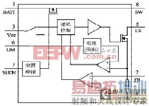 各引脚功能如下:1脚BATT为外接电源电压输入端,接电源正极,输入电压范围0.8~5.5V,极限电压为6V,内部接PMOS电源开关控制管,在关闭状态下漏电流约为0.1μA;2脚FB为反馈电压输入端,内部接误差放大器的同相输入端,反向输入端的基准电压是1.25V;3脚Vcc为开关稳压电源脉宽调制器的电源电压输入端,PWM的工作频率是500kHz,工作电压范围为2.4~5.5V,极限电压为6V,正常工作电流约为160μA,在关闭状态下漏电流约为0.1μA;4脚GND为接地端;5脚LX内接NMOS主开关管漏极,外接升压电感,开关管的最大允许电流为0.5A,极限电压为30V;6脚LIM为开关管最大工作电流限制设置输入端,接Vcc时,开关管最大限制电流为500mA,悬空时,开关管最大限制电流为250mA,接地时,开关管最大限制电流为125mA;7脚SHDN为开关电源启/停控制端,高电平开启,低电平关闭,在关闭状态下电路的耗电可忽略不计;8脚SW为升压电感外接端,在工作状态相当于直接与1脚相连。